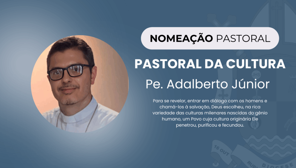 A Diocese de Rubiataba-Mozarlândia deu um importante passo na promoção do diálogo entre fé e cultura. O Padre Adalberto Júnior foi designado para assessorar a implantação da Pastoral da Cultura, conforme comunicado oficial feito pelo Administrador Diocesano, Padre Diomar Aparecido Xavier durante a Avaliação Diocesana realizada em 15 de novembro.