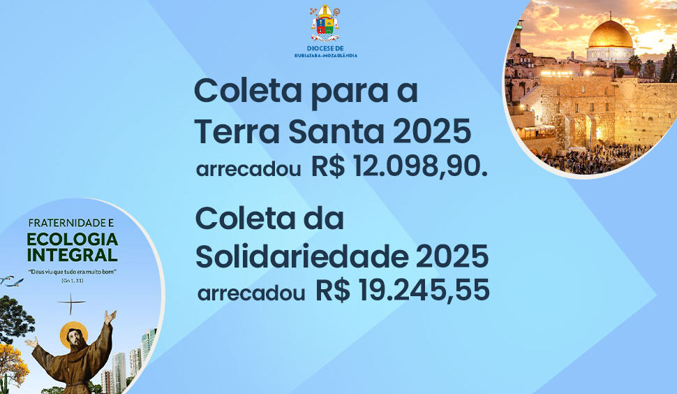 A Diocese de Rubiataba-Mozarlândia divulga o resultado da Coleta para a Terra Santa e da Coleta da Solidariedade 2025. A Coleta para a Terra Santa, realizada no dia 18 de abril, com a finalidade de sustentar os cristãos e os lugares sagrados na Terra Santa, arrecadou neste ano, em nossa diocese, R$ 12.098,90.